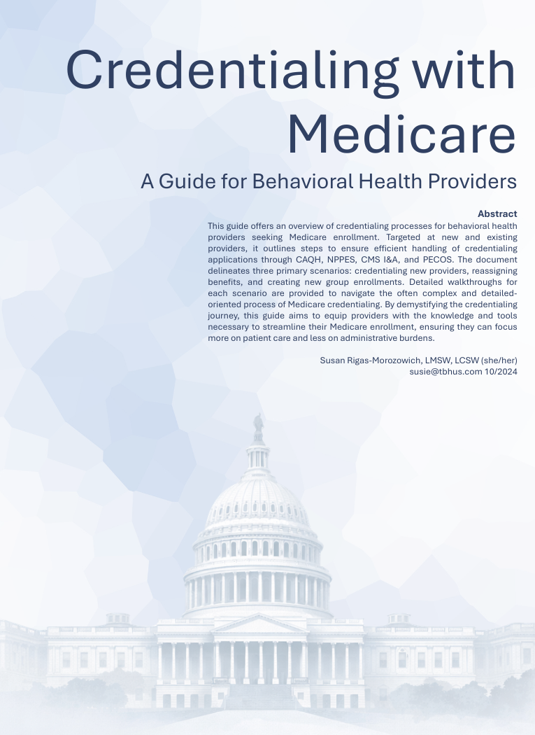 Susie Morozowich, LMSW, LCSW, is the Founder and CEO of TelebehavioralHealth.US, a multi-state group practice providing outpatient behavioral health services. She has spent the past decade building and managing an insurance-based practice, including becoming the first all-digital behavioral health provider to partner with Medicare. Since founding TelebehavioralHealth.US in 2016, Susie has built and maintained payer relationships across Medicare, Medicaid, and commercial insurance networks, supporting participation with more than 40 payers across 15 states. Her experience spans the full credentialing lifecycle, including provider enrollment, system management through platforms such as CAQH, NPPES, and Medicare PECOS, and ongoing contract and network oversight. Susie's work reflects a practical, working knowledge of how credentialing and contracting function within real-world practice, including the interplay between enrollment, reimbursement, compliance, and access to care. Her approach is informed by direct experience navigating these systems at scale, with an emphasis on accuracy, efficiency, and long-term sustainability.