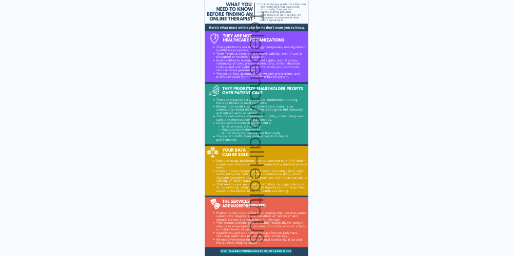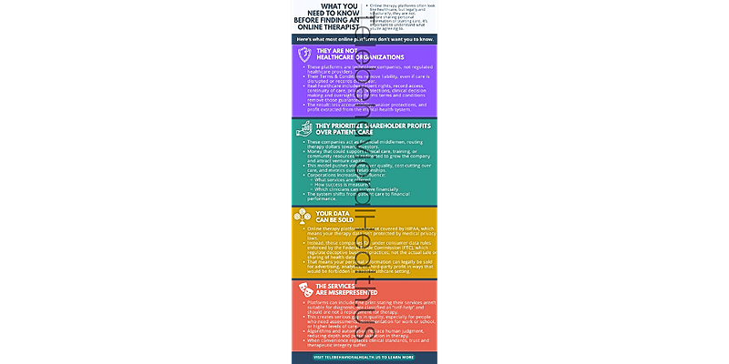 This information sheet sheds light on the hidden risks of many online therapy platforms. While they promise affordable and accessible care, many are actually driven by profit rather than genuine patient support. It explains how corporate-run therapy services can compromise privacy, pressure therapists to see too many clients, and cause instability for both providers and patients. The piece encourages people to choose independent or provider-owned practices where privacy, trust, and long-term healing truly come first.